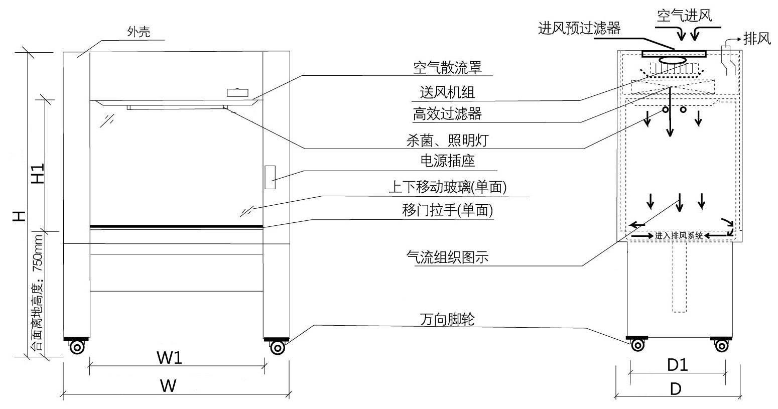 凈化工作臺由箱體、風機、高效過濾器、操作開關(guān)等幾大部件組成。箱體采用彩鋼板等制作,表面噴塑處理,工作臺面采用不銹鋼制作。凈化單元采用了可調(diào)風量的風機系統(tǒng),通過調(diào)節(jié)風機的工作狀態(tài),可使?jié)崈艄ぷ鲄^(qū)中的平均風速保持額定范圍內(nèi),而且有效地延長了高效過濾器使用壽命。